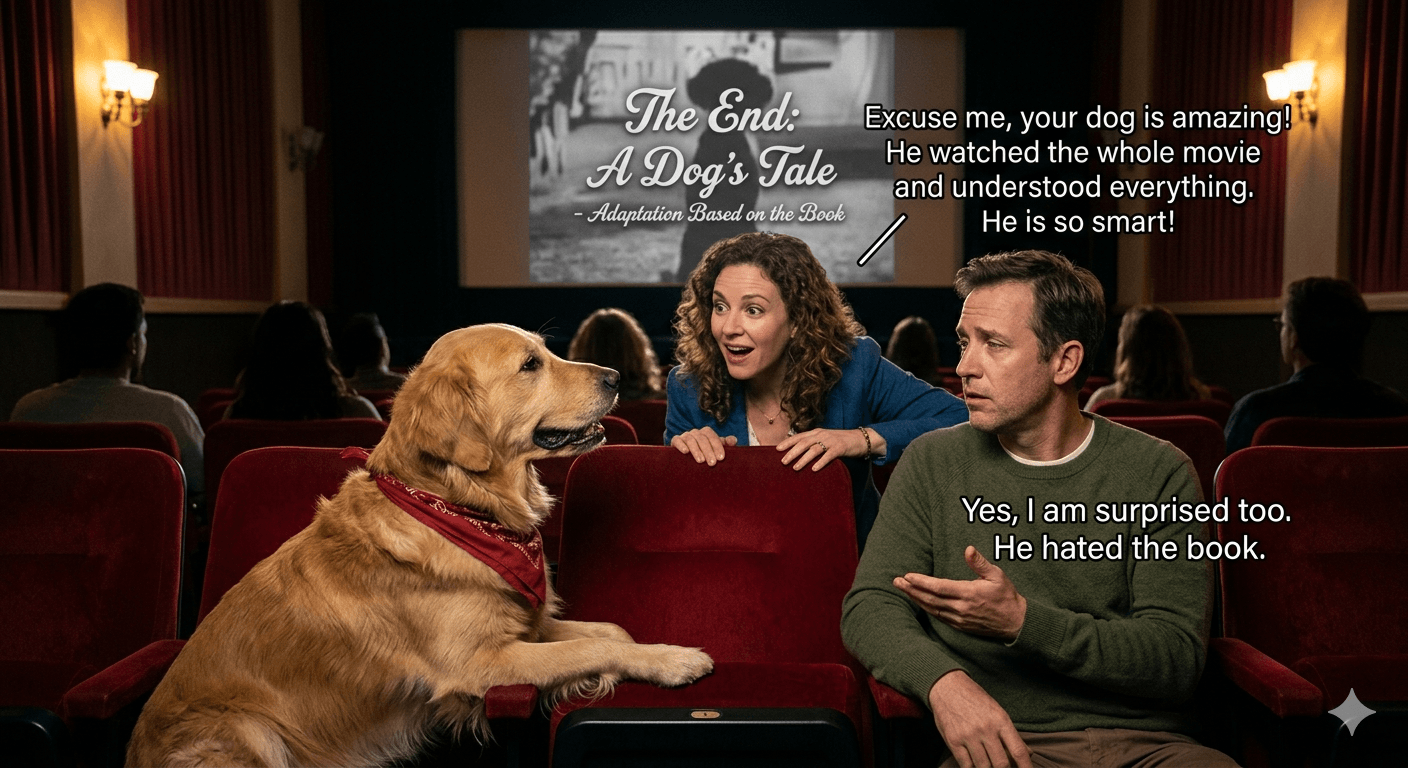 One day, a man goes into a movie theater. He is not alone. He has a big dog with him. The man buys two tickets: one for himself and one for his dog.