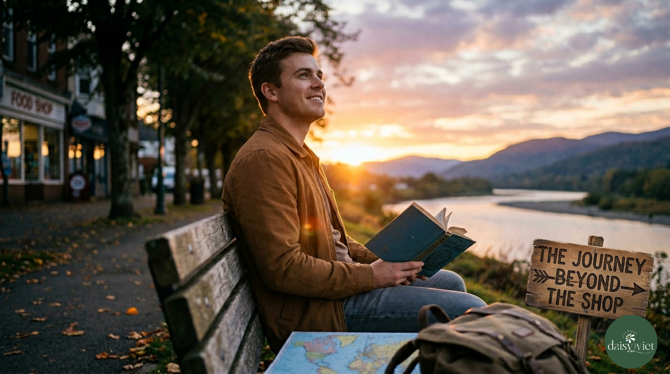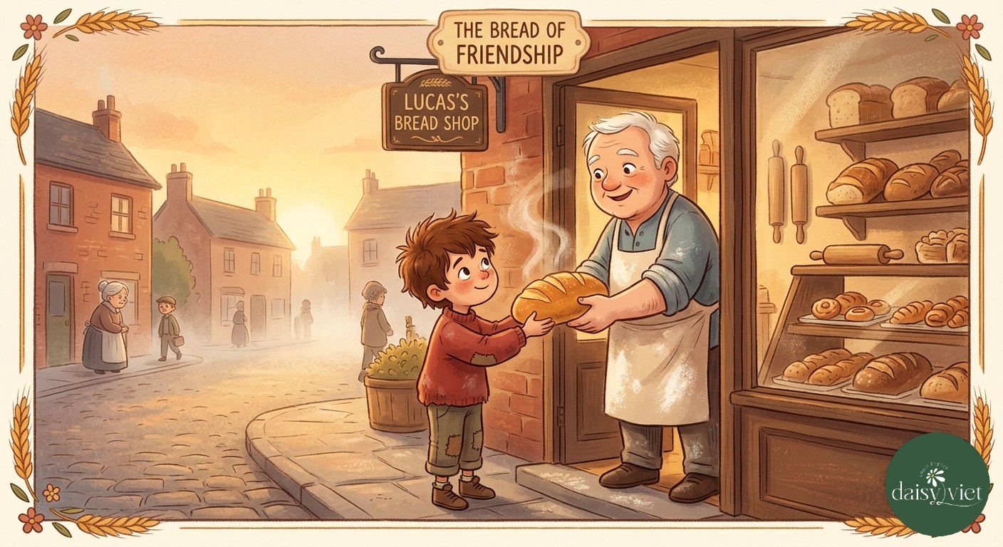 Tom lives in a small, quiet town with many green trees. Every morning, he wakes up when the sun is still low in the sky. He eats a simple breakfast and walks to a big food shop in the center of town.